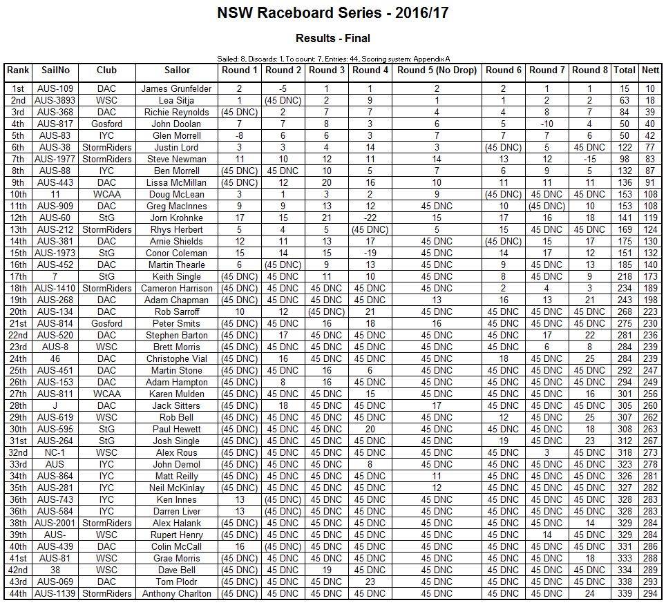 2016/17 NSW Raceboard Series Final Results