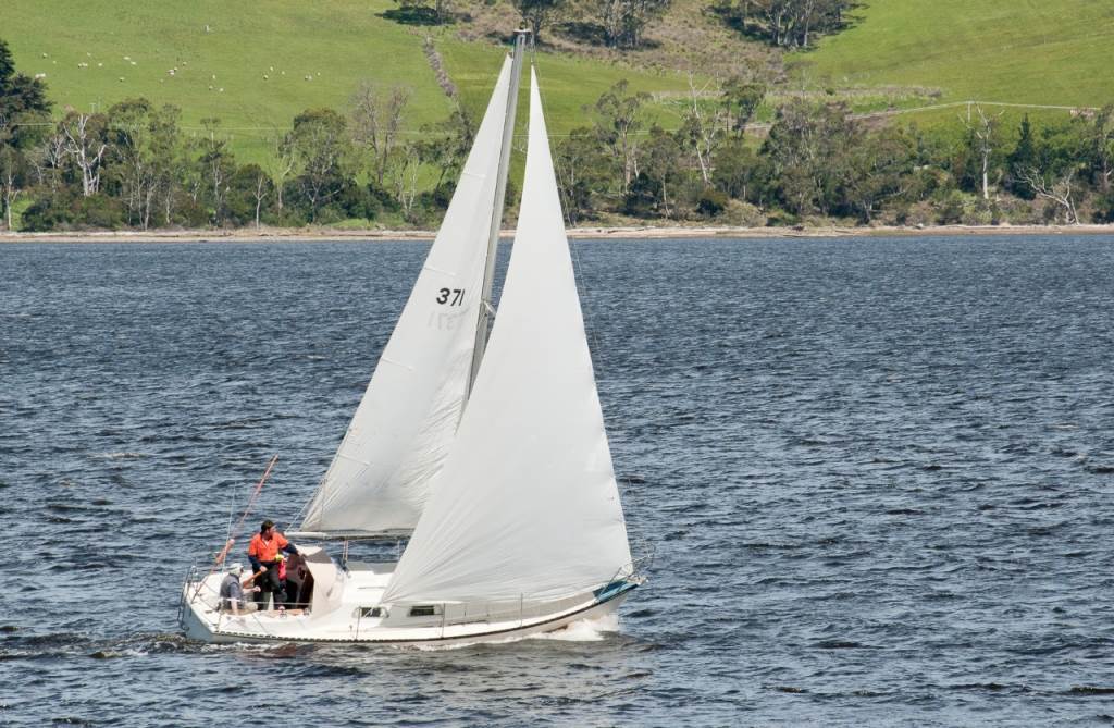 Holding headsail out with boat hook while racing