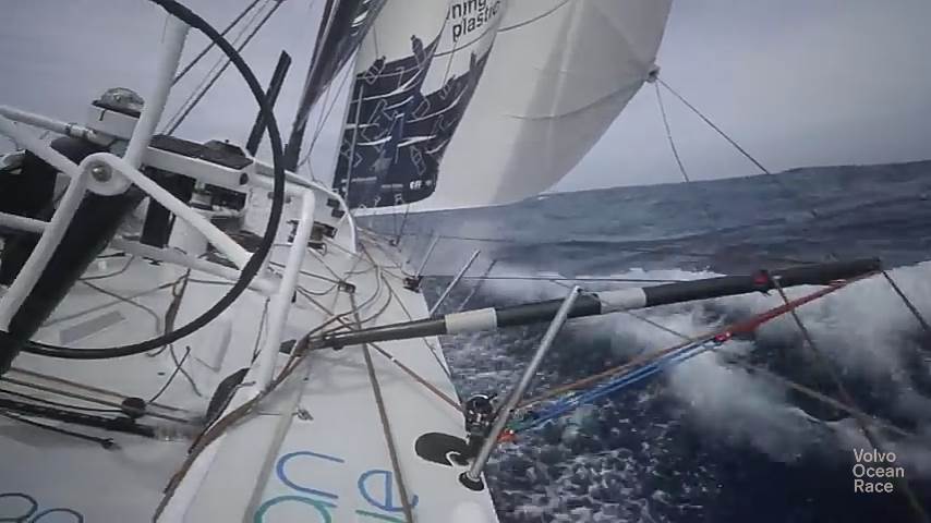 Holding headsail out with boat hook while racing