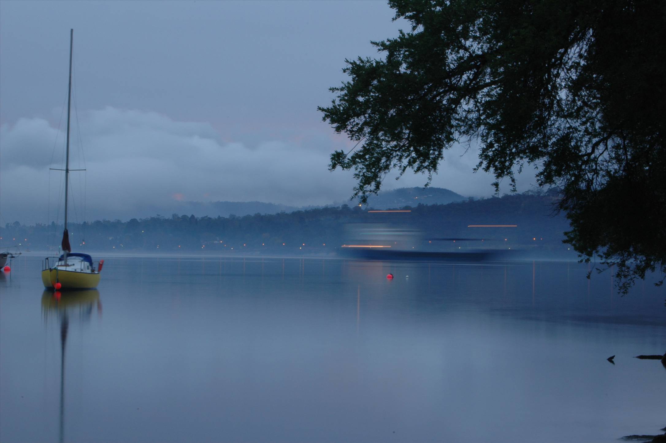 Sailing Hobart fog with ghosting ship