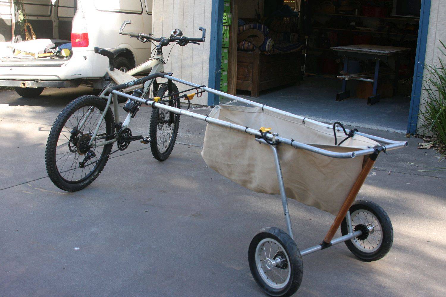 converted pram with telescopic side arms....ali poles from camp shop......from kite to sup.....