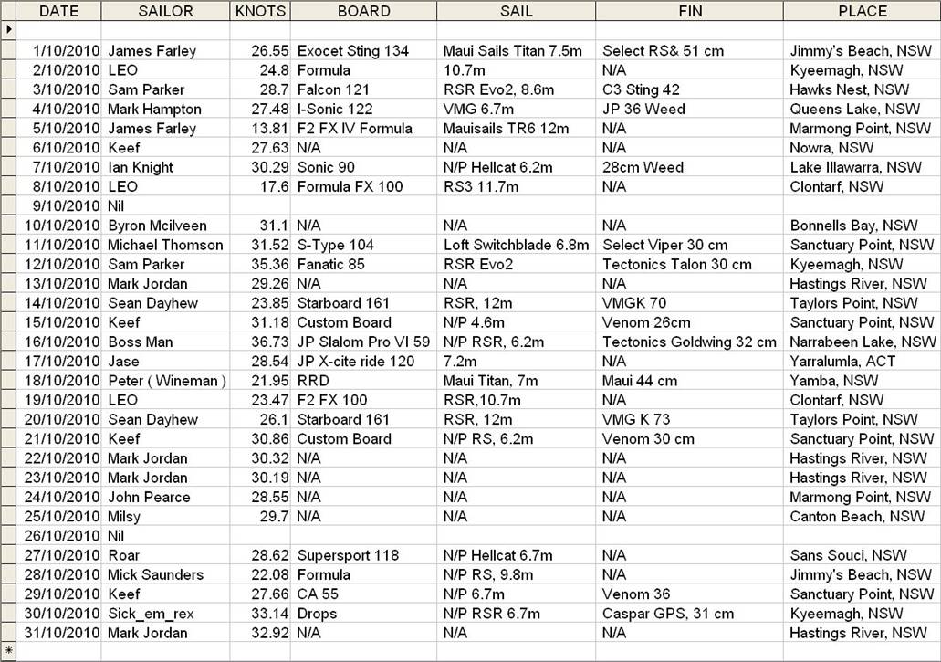 Windsurfing October Daily Top Speeds