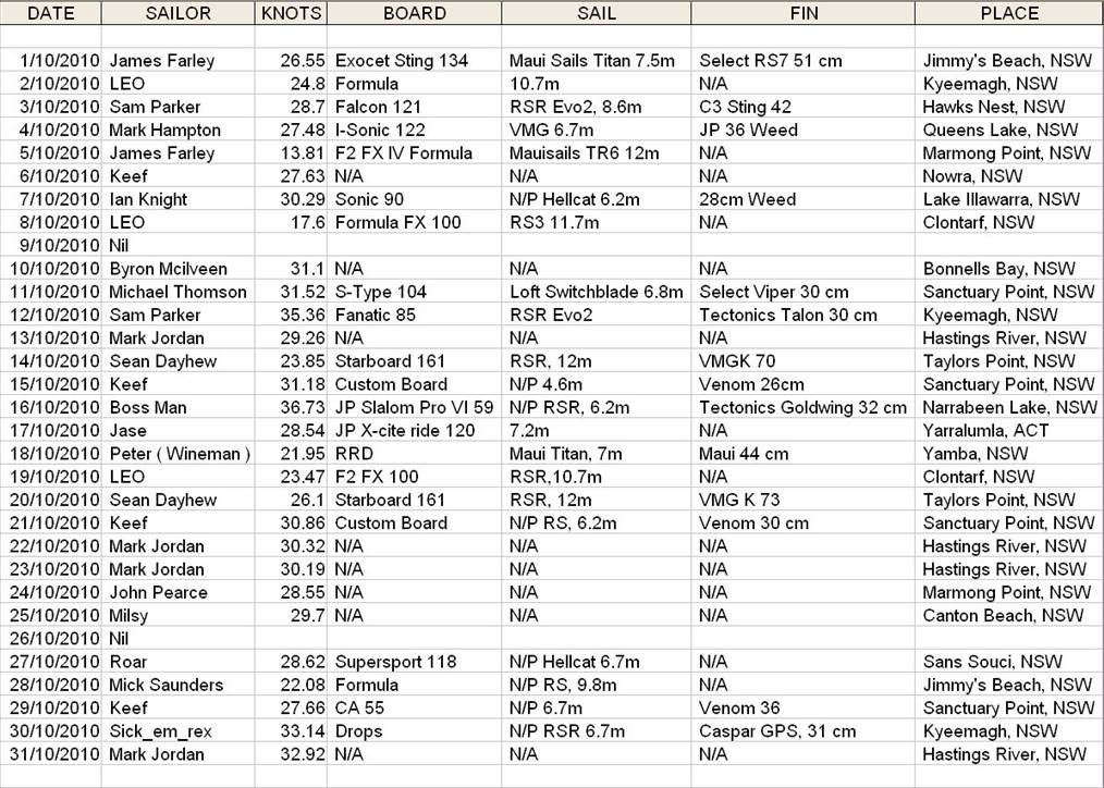 Windsurfing October Daily Top Speeds
