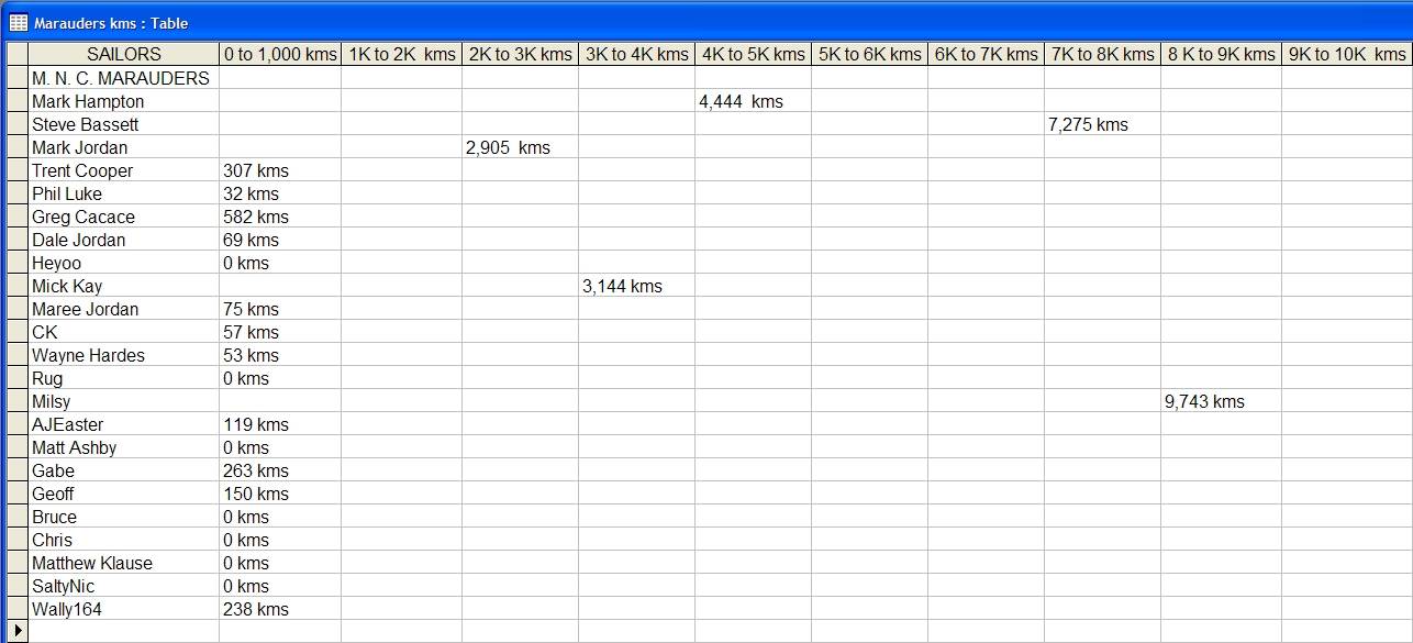 NSW SAILORS Accumulated Kilometres Table. (GPS.TC)