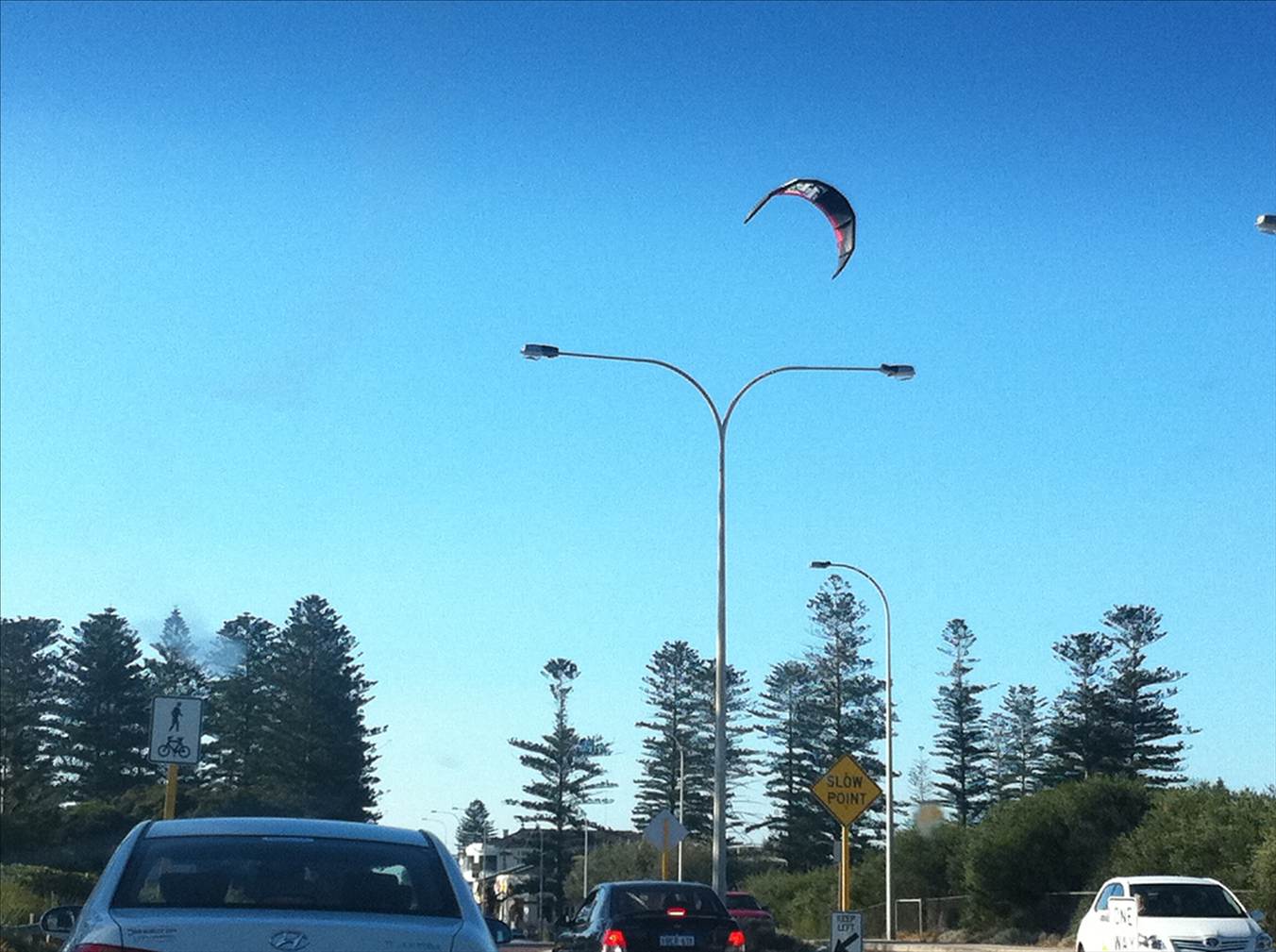 Guy with kite up on the street, Cottesloe