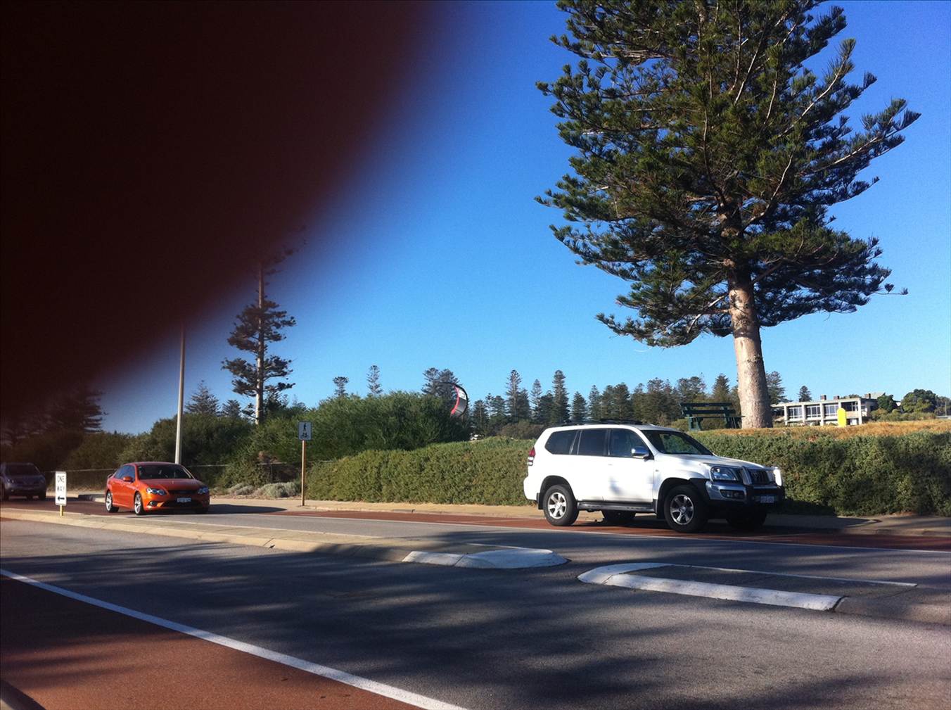 Guy with kite up on the street, Cottesloe