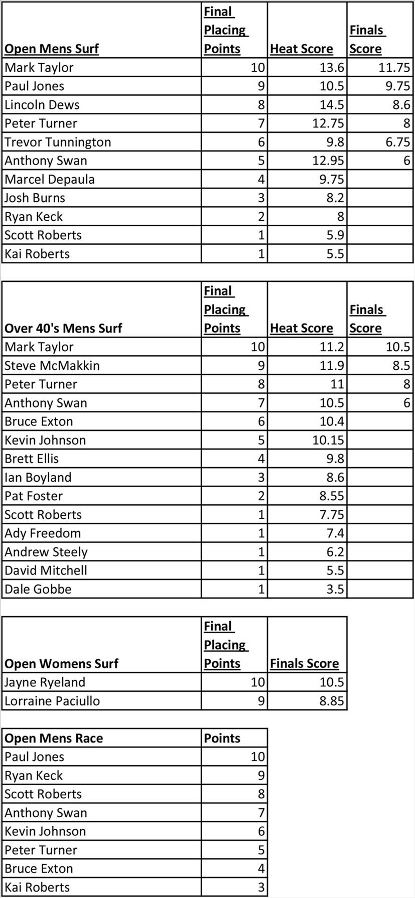 Sunshine Coast SUP Club Scores from Sept 9.