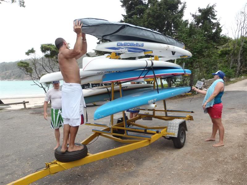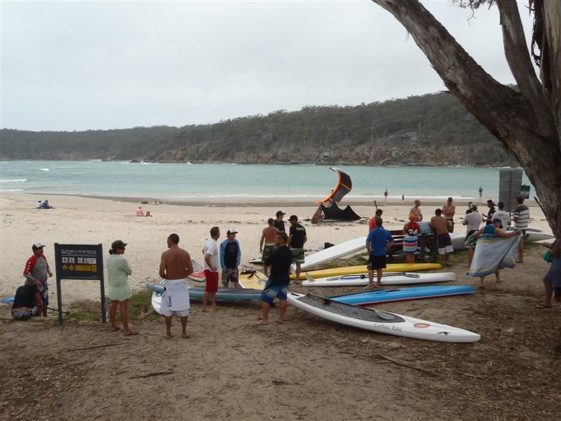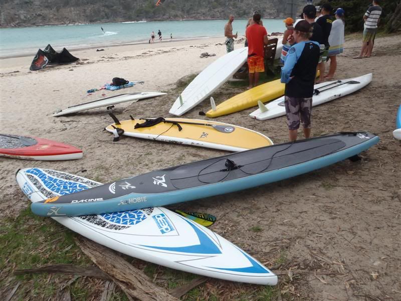 I dumped my car at Pambula and jumped in the last bus taking people to the start. What a rush - not in the adrenaline way, just in the hurried way. We got to Bar Beach and there was my board. Some nice soul had already taken it off the trailer, carried it down to the water's edge and even ... what? ... put a legrope on it? Why would somebody do that? At that moment, Brian, one of the Walk On Water guys came bumbling around from behind the bushes and asked what I was doing there - apparently nobody thought I was going to show up so he had helped himself to the Deep 12'6". Ahhhh. So now I was stuck at the start point with no board and my car at the end point. How is this going to work? Thankfully Jason had a spare 11'0" wide-nosed Hobie in his van and he let me use it. Even more thankfully, Brian said he would use the 11'0" Hobie and let me paddle the Deep. What a guy! We got the Hobie out and legropped up the boards. I headed back to the bus to get my paddle ... huh? Locked. Where is that Angie Pangie? Ummm, she is out on the water beginning the paddle out to the tip of the point. "Angie! Where are the keys?", I yelled out the top of my voice. She continued to paddle out to the tip of the point, oblivious to my drastic predicament. "Hey Jason, have you got a paddle to go with that Hobie you lent us?". He did.