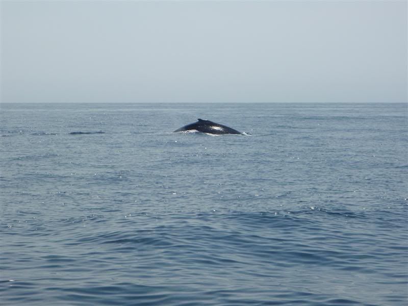 Here is a cool pic of a whale out on the Merimbula Bar early two sundays ago . As the whale passed Ben ( kneeling ) it popped its head out as if to say ' morning mate '