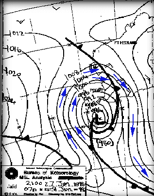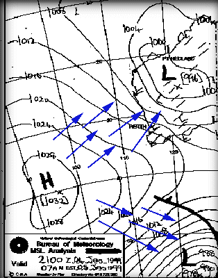 Wind Glorious Wind... If you're into a sport that is powered by the wind, or want to avoid windy days then it pays to understand how wind works. Wind... Wind is the movement of air molecules from one location to another. The perfect demonstration of wind is with a fully inflated a car tire. If you open the valve on the car tire, air rushes out. Why? Because there is more air pressure in the tire than there is in the atmosphere, and the atmosphere is always seeking to equalise pressure. Higher pressure pockets of air (i.e. inside the car tire) move to equalise lower pressure areas. So what causes these low pressure areas? Well, in the case of a seabreeze, it's caused by heat... Seabreezes... Cold sinks, heat rises. It's the concept that makes hot air balloons work, and why your vegies are at the bottom of the fridge. During a summer day, the land is heated by the sun, and this heat is absorbed by the surrounding air. Once this air meets a particular temperature, it begins to rise quite rapidly. As a result, a low pressure area is created at ground level. The sea doesn't heat up as quickly as the land, so the air temperature over the water is much less. As a result, this air is free to move sideways to occupy our new low pressure area. The result is a light to gale force wind which rushes in from the sea to fill the lower pressure area left by the hot air rising from the land. Seabreezes usually happen in spring and summer, when the difference in temperature between land and sea is greatest. Seabreezes are the most amazing phenonenom. For many years I never really paid much attention to the wind. One day, we arrived (late) at the local river to do some water skiing. It was around 1pm, the water was glassy - perfect conditions. Then, me mate Mick says "Here comes the seabreeze...". Looking across the river we could see an approaching line of rough water. And then it hit us full on - the full glory of a 25 knot seabreeze. What's even more amazing is that the wind can be travelling faster than the front of the seabreeze. It can be progressing inland at 25 km/h, but the actual wind can be blowing at 35 km/h! Sometimes the seabreeze can reach many kilometers inland, and other days it teases you by staying just offshore, coming in, and then going out again. So to get a seabreeze, it needs to be hot inland. But too hot and you won't get one at all. To explain why this is the case, we need to understand high's and low's and the squiqqly charts they show on the telly called 'Synoptic Charts'. Synoptic Charts... You need to understand these if you want to have your own guess at what the wind may do. It also assists to understand what the weather man is talking about. Sometimes our local TV weather reports simply say '.. and an afternoon seabreeze'. About as useful as an ashtray on a motorbike.