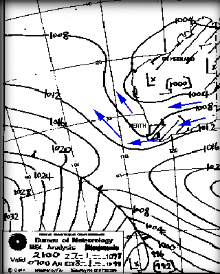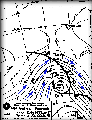 But don't forget. This all gets totally ignored by local wind effects such as seabreezes along the coast in the afternoon. This synoptic chart is a joy to a wind fanatic living on the coast of Western Australia because this pattern means wind - and lots of it - these cool winds also keep the maximum temperature down. In fact, the forecast for this pattern was: TODAY'S MAX: 23 C (74 F)The S/SE winds in the morning reflect the anti-clockwise direction of wind around the high, untill the afternoon when the thermal induced seabreeze kicks in and changes to an onshore S/SW. Bliss!